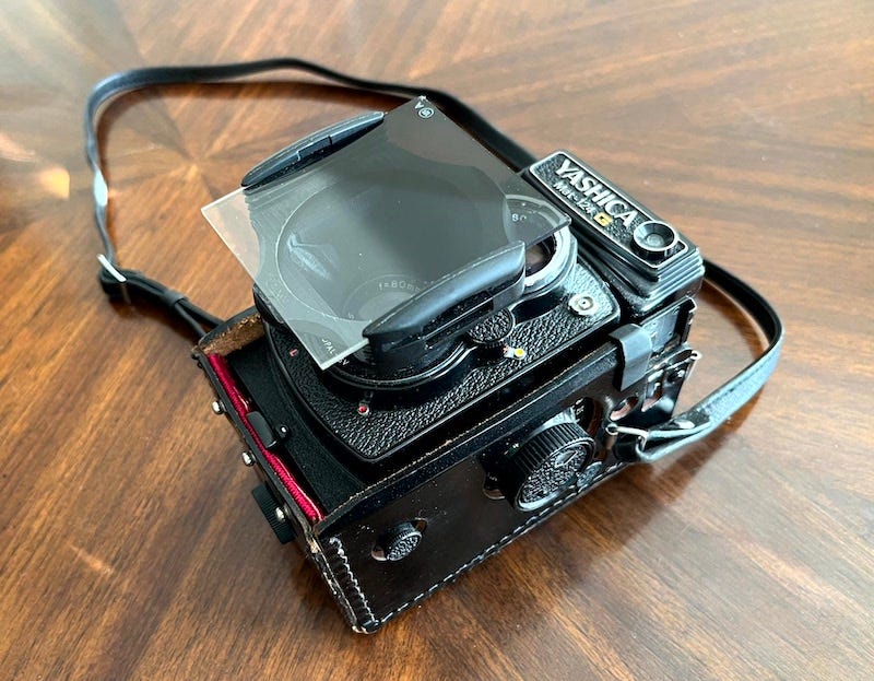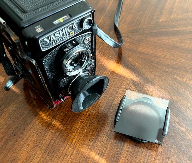For Yashica Mat cameras, I made a right-angle attachment for pocket lightmeter, a spare lens shade and a special lens shade that is also an adapter for Cokin A system. Using it, I can use Cokin A graduated filters. Of course, it works through the rather imprecise method of “eyeballing” the cutoff line. I need to test using it on the viewing lens to set and transferring the assembly to the taking lens. Maybe it will work…